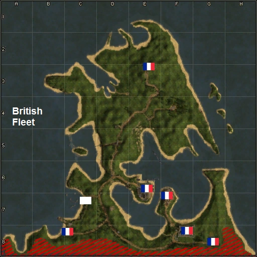 The British have an Attacker-class escort carrier, a Dido-class cruiser, a Flower-class corvette, and a Landing Craft Mechanized to begin the assault. The French have a number of tanks, stationary weapons, and aircraft for defence.